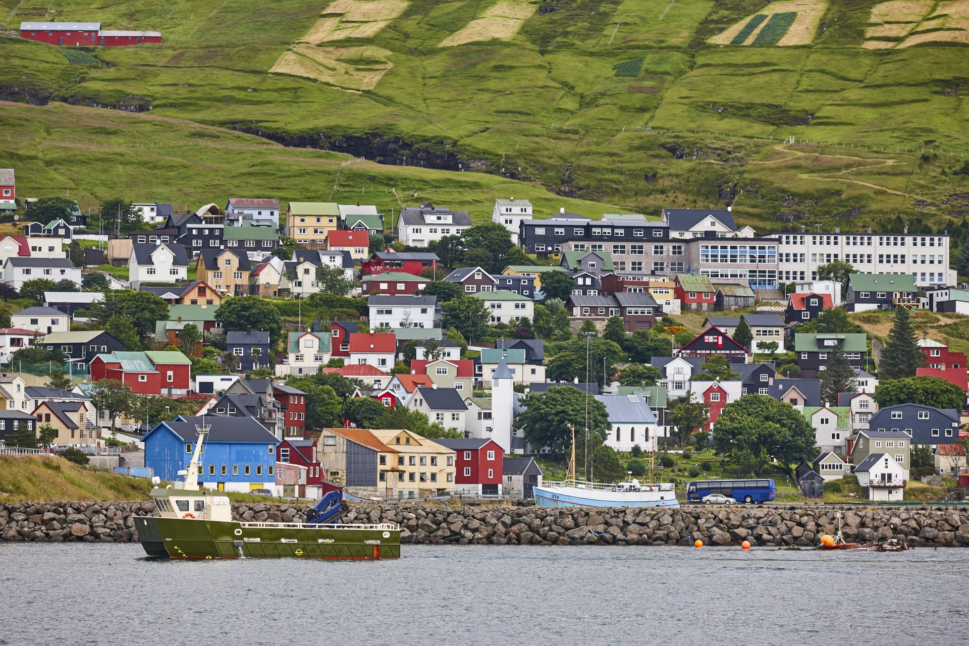 - Klaksvík harbor: flat promenade and coffee shops.