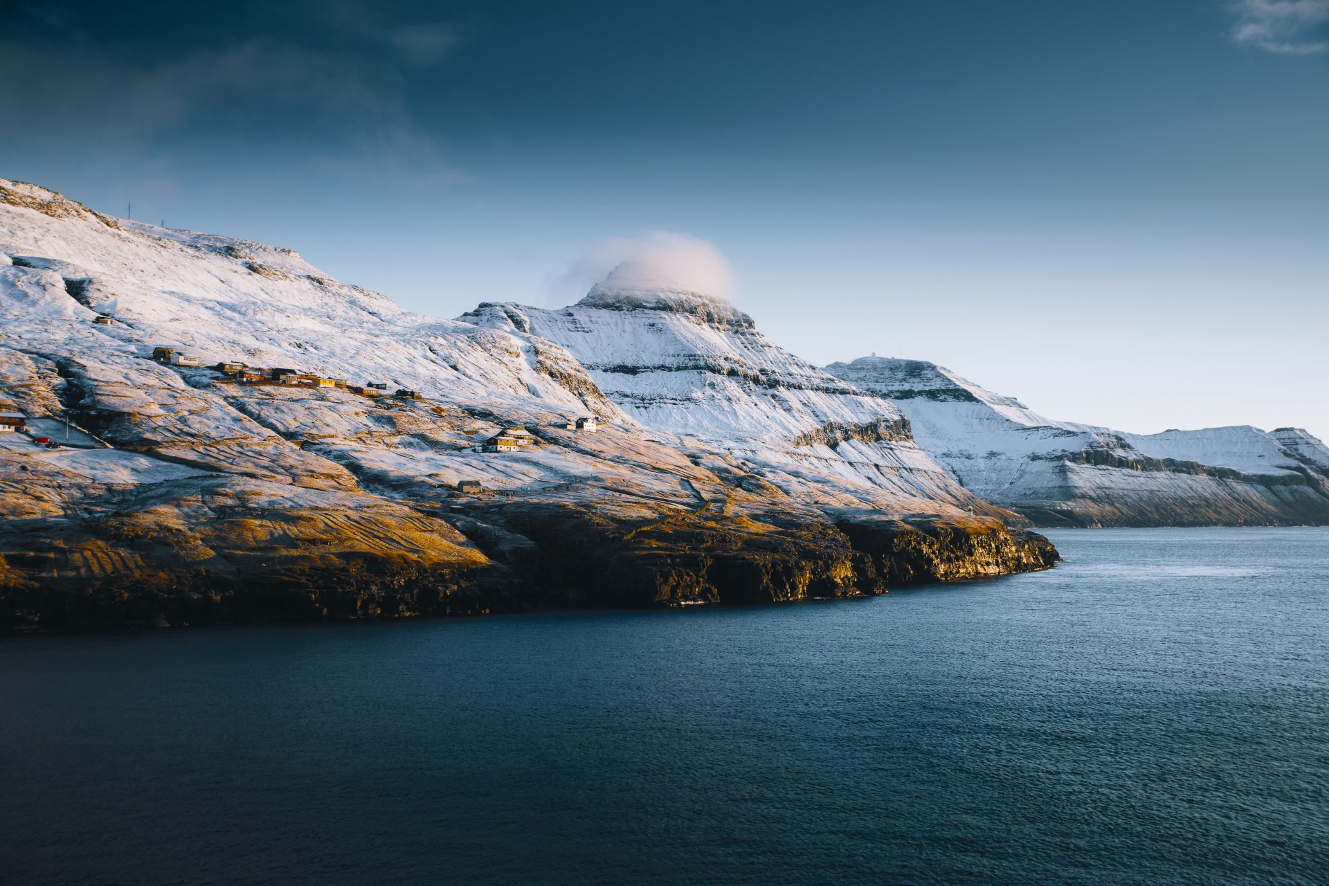 Winter light in the Faroes is cinematic: mist glows over black cliffs, sunlight pierces clouds, and reflections in calm fjords. It’s less about perfect skies and more about mood.